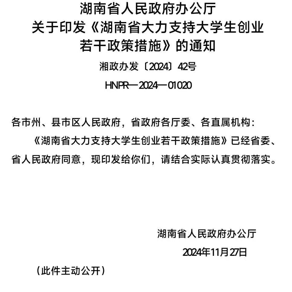 为深入贯彻党的二十大和二十届二中、三中全会精神,认真落实省委十二届七次全会关于支持大学生创业“七个一”部署要求,在政策、基金、孵化、导师、课程、典型、宣传等七个方面出台一批支持政策,为大学生在湖南创新创业提供全面保障,推动大学生留湘来湘创业,努力把湖南打造成大学生创业的热土和对年轻人友好省份,为实现“三高四新”美好蓝图提供坚实人才支撑和持久动力,制定如下政策措施。